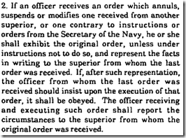Actually he refused and extended a challenge to be court-martialled, but that may just be quibbling with the choice of language. What is most interesting is another reference to his prior use of “military channels.” The military culture, IMHO, allows for situations where a person may question an order for many reason. But, once the order is affirmed and if appropriate an explanation is given, the order must be executed. I think there is a sufficient analogy in U.S. Naval Regulations.